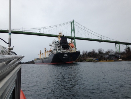 The Coast Guard is responding to a 621-foot bulk carrier which ran aground in the vicinity of Wellesley Island, in the St. Lawrence River, New York, Monday. The motor vessel is aground and taking on water in one of the forward ballast tanks. The vessel is slightly listing to port with 18-feet of water in the forward peak of the vessel. There are no reported injuries to the crew, and no reported pollution. The motor vessel Juno, a Bahamian-flagged bulk carrier with a load of sugar, was transiting inbound from the St. Lawrence Seaway to the Port of Toronto. At about 1:10 a.m., a watchstander at Coast Guard Sector Buffalo received a report from the Saint Lawrence Seaway Development Corporation of a bulk carrier that was hard aground in the vicinity of the Thousands Islands Bridge. The vessel did not come in contact with the bridge. Vessel navigation is currently suspended in the vicinity of the grounding. There are three other vessels in the area waiting for the navigational channel to re-open.Coast Guard marine inspectors from the Coast Guard Marine Safety Detachment Massena, New York, are on board the Juno with SLSDC representatives conducting an initial investigation along with the SLSDC. A crew from Coast Guard Station Alexandria Bay responded to enforce the waterway closure and monitor the situation.For more information about this case please contact the Coast Guard 9th District public affairs office at 216-902-6020 or 216-310-2608. The motor vessel Juno, a 621-foot bulk carrier, sits aground under the Thousand Islands Bridge near Alexandria Bay, New York, April 20, 2015. The vessel ran hard aground after suffering a steering casualty, and at this time there is no pollution reported. (U.S. Coast Guard photo) The motor vessel Juno, a 621-foot bulk carrier, sits aground under the Thousand Islands Bridge near Alexandria Bay, New York, April 20, 2015. The vessel ran hard aground after suffering a steering casualty, and at this time there is no pollution reported. (U.S. Coast Guard photo)
