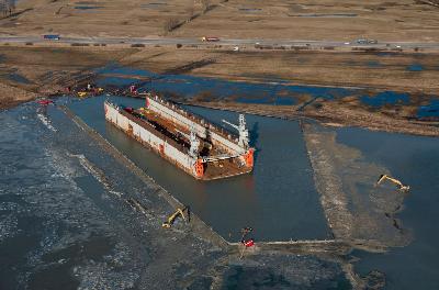 The floating dry dock, 165 x 35 meter in dimension, broke loose from its mooring at the southern quay of Oresund DryDocks premises in Landskrona on the 27th of November 2011. The dock drifted in an eastern direction towards bay of Lundåkra, due to the high sea water level occurring at that day it passed over the very shallow waters and stranded approximately 3 kilometres from its original position. The floating dock then came to a stop in a sensitive Natura 2000 area. Unconventional method Because of the very shallow water depth of 0.5 meter and the protected nature area, Koole Maritiem developed an unconventional method for re-floating. With a little help from an old friend called Archimedes, thinking out-of-the-box, actually resulted into thinking inside-the-basin. Preparations At the end of January 2012 and with the use of 200 cranemats and 175 steel beams, the Dutch company built an artificial basin with an area of approximately 28.000 m² around the dock, while at the same time three excavators were digging a 2 meter deep channel with a length of 1,8 km. When the basin was finished, a gully with a depth of 2 meter was excavated as well inside of the basin, where the dock could stay afloat. All the preparations, operated during a very cold month, were finished at the end of February. Then it was time to wake up the sleeping giant, to return home. First movement When the basin was filled with about 60 million litres of water, the dock was refloated. At that point it was repositioned with the use of winches, anchors and cranes, and pointed in the direction of the newly formed channel, just above the deep gully. Moving through the channel With an alive, floating and repositioned dock, the basin was emptied and, the water level lowered to sea level again. At this point only the weather stood in the way of returning the dock. When the wind and tidal conditions were optimal, the dock was slowly but steady moving in the direction of open sea. Returning home When the dock left the temporary channel, it was towed with the use of two tugboats and assisted by a third tugboat, back to the original location at Oresund Drydocks on the 14th of March 2012. This was a sight to be seen and a crowd of spectators were witness of this unusual transport. Operations Koole Maritiem executed these operations with the utmost precision and care, minimalizing the impact on the environment and respecting the protected nature area. The operations were finished well within the required time schedule and with the dock returned, the environment is now being restored to the original state.