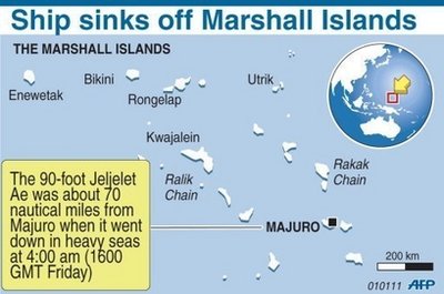 A supply ship in the the Marshall Islands with twenty aboard sank early Saturday. The 90-foot Jeljelet Ae was about eight hours into its trip to Likiep Atoll, reported the AFP.