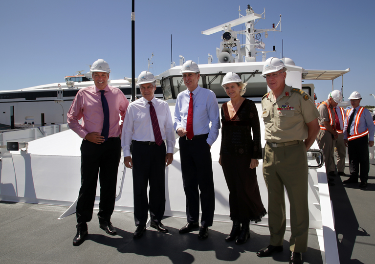 The Rt Hon Philip Hammond MP, the UK Secretary of State for Defence, was accompanied by Australia’s Minister for Defence, the Hon Stephen Smith, MP; Australia’s Chief of Defence Force, General David Hurley, AC, DSC; Australia’s Defence Secretary, Mr Dennis Richardson, AO and other defence personnel from both the United Kingdom and Australia. The visit was hosted by Austal’s Chief Executive Officer, Andrew Bellamy, who said it was an honour to receive such an important delegation. “We are delighted that Secretary Hammond and the Australian defence leadership decided to include Austal in a busy schedule centred around the Australia-UK Ministerial Consultations (AUKMIN),” he said. “The visit reflects Austal’s status as a global defence prime contractor.” Mr Bellamy; Austal’s Vice President – Defence, Davyd Thomas; and other senior Austal personnel briefed the visiting party on Austal’s activities in ship design and construction; systems development and integration; and in-service support. This included updates on Austal’s role as prime contractor for the US Navy’s multi-billion dollar Independence-variant Littoral Combat Ship (LCS) and Joint High Speed Vessel (JHSV) programs, as well as the Cape Class Patrol Boat project being undertaken for the Australian Customs and Border Protection Service. Austal’s expanding international vessel support network was also discussed in detail. The visit included a tour of the first Cape Class Patrol Boat, which was recently launched at the shipyard, and a 102 metre Austal trimaran. These demonstrated the advantages of high speed vessel and systems technology very similar to that used in the LCS, JHSV and other Austal defence programs.